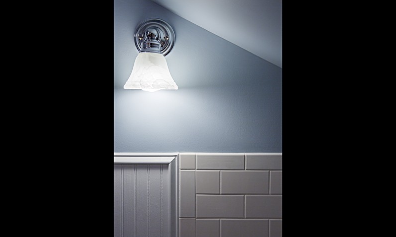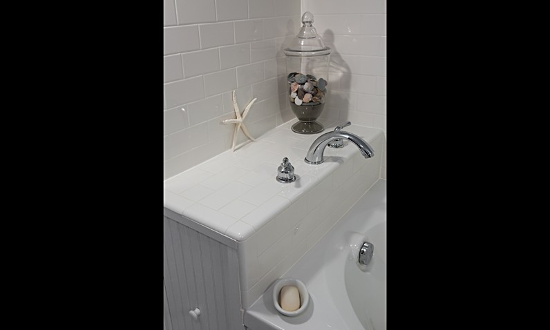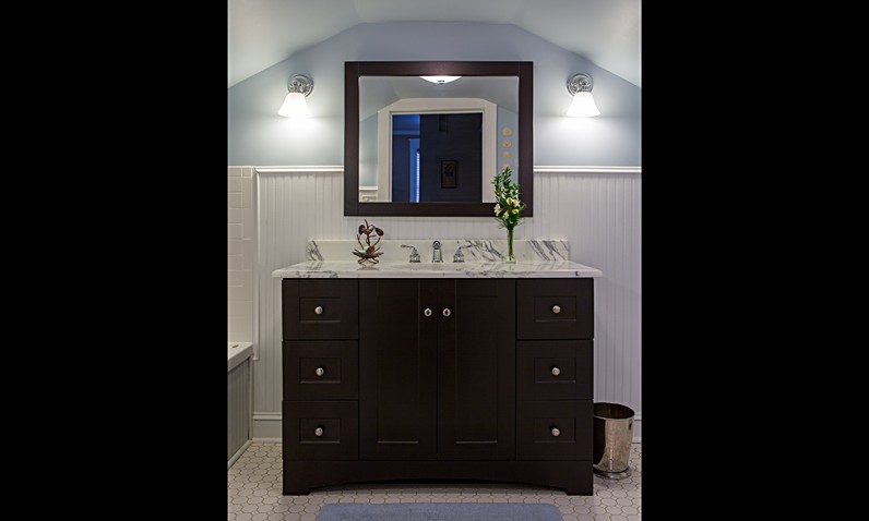 Hard to believe, but this one was carved out of a second-story space that originally contained only an old bathtub, small vanity and toilet.  The project began with closing off the exterior window to make room for the large bureau-style vanity and mirror.  The old claw-foot tub was replaced with a beautiful Jacuzzi tub.  The toilet was relocated around the corner just out of sight from the bedroom doorway.  While white subway tile and bead board are popular retro-style materials today, here they work well to enhance a beautiful master bath design while maintaining the rich character of this older home.
