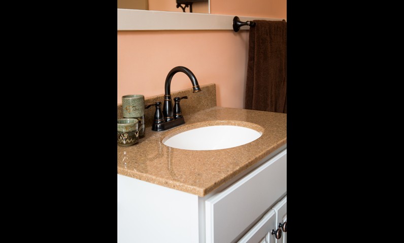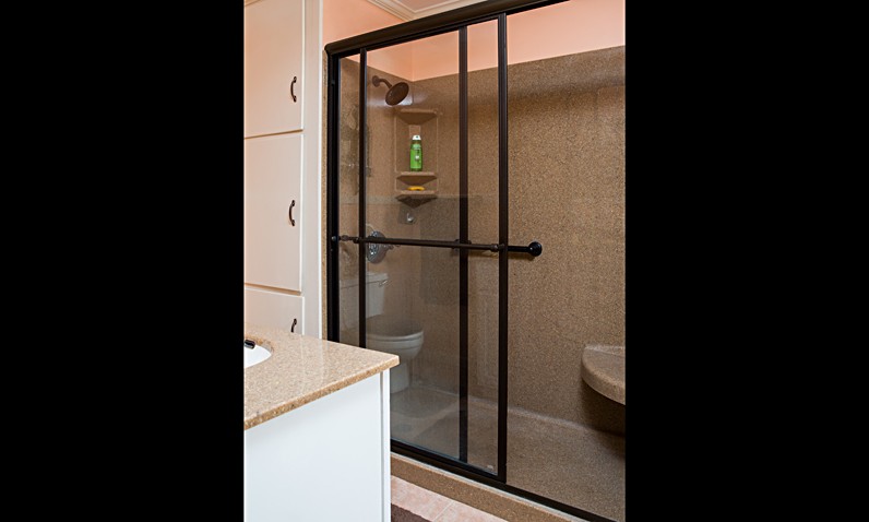 The owners of this beautiful Victorian home already had every homeowner’s dream — a large second story bedroom suite complete with sitting room leading into a large bedroom leading into a bathroom. A very old-fashioned bathroom with outdated fixtures. The bath was modernized by removing the old cast iron tub and replacing it with a spacious 5-foot Onyx shower in a sandy stone color. The interior grab bars and rain shower head are the same rich dark chocolate color of the sliding glass door frames. The vanity top echos the same smooth surfaces of the shower, and the cabinet below provides much needed storage. Simple, but modern…. a lovely and functional addition to the master suite.