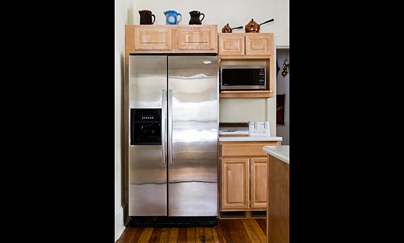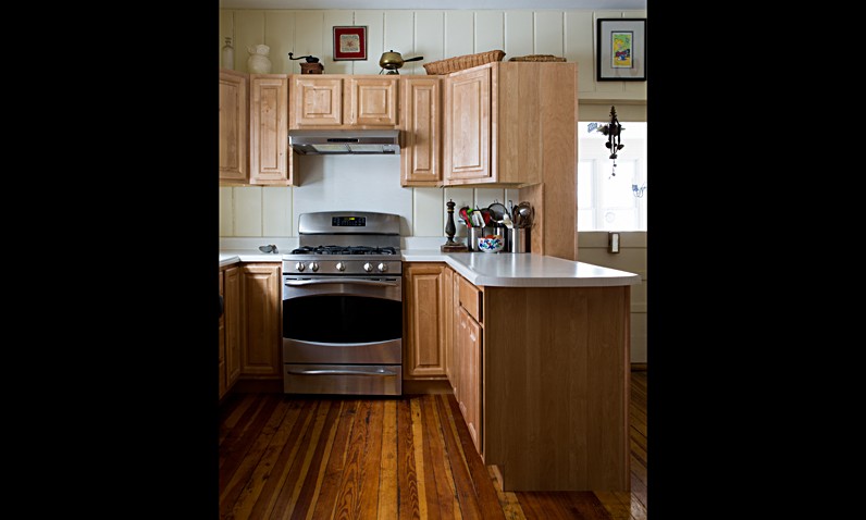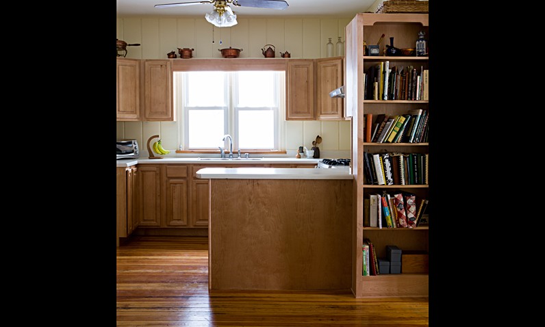 The knotty pine walls of this kitchen made the small space look and feel dark.  Wanting to keep the integrity of this period older home, the owners opted to update the pine walls with a coat of fresh light mustard colored paint.  New cabinetry and countertops updated the space, topped off by modern new stainless appliances.  The space was also made brighter by applying the white tile backsplash.  The peninsula counter was added for much needed functionality.  Leimkuehler Construction tweaked the homeowner’s original design to include the oak bookcase that displays the owner’s many cookbooks and placed them at her fingertips.  The original plank flooring was restored with sanding, stain and varnish, resulting in a rich color of wood that keeps the space light.