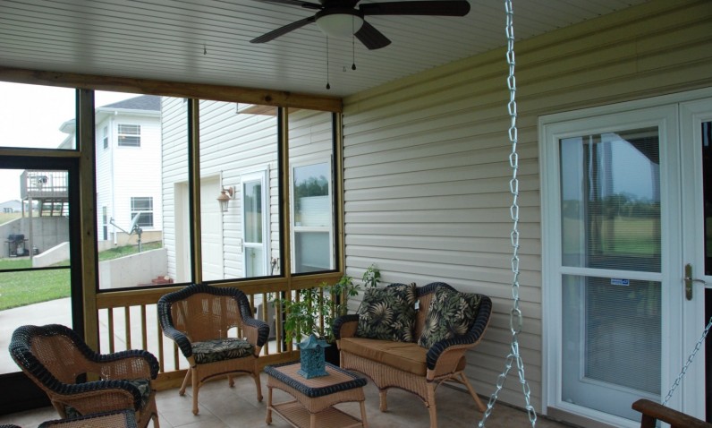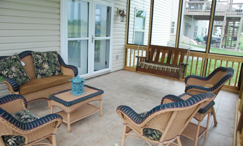 So many times we see people with beautiful decks that wish they could also have a covered sunporch or patio in the same space.  Yet decks are designed to drain, so how is it possible to create an enclosed sunporch underneath that deck?  Here we used aluminum soffit, a product which allows the ceiling of the covered enclosure to serve as a giant gutter system.  The gentle slope of the room’s ceiling channels moisture from the deck above down to the actual gutter at the far wall of the room.  There it is carried away to a traditional outdoor downspout and away from the foundation.  The ceiling soffit is made in such a way that it resembles the car siding that was used for porch ceilings many years ago.  Here it creates a smooth and attractive surface that is durable and immune to moisture.  The homeowner styled this space with wicker furnishings, a porch swing and an outdoor ceiling fan, creating an outdoor space for quiet relaxation three seasons of the year.