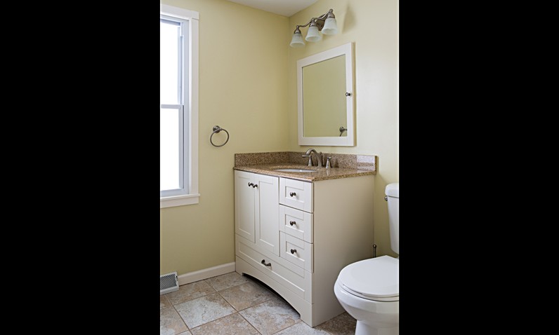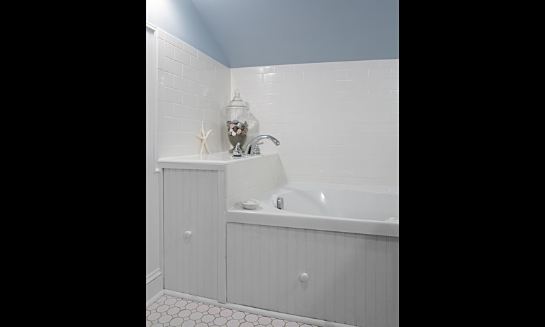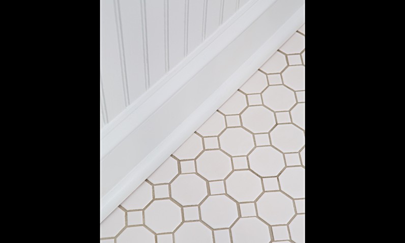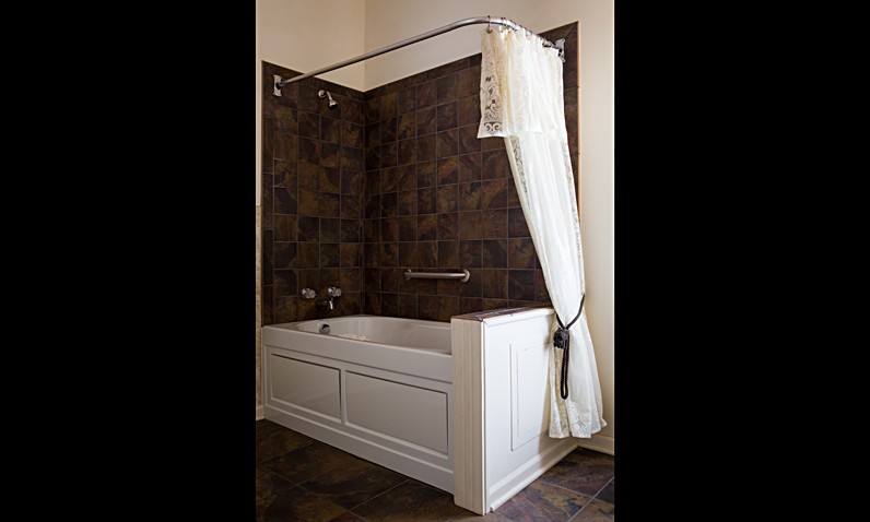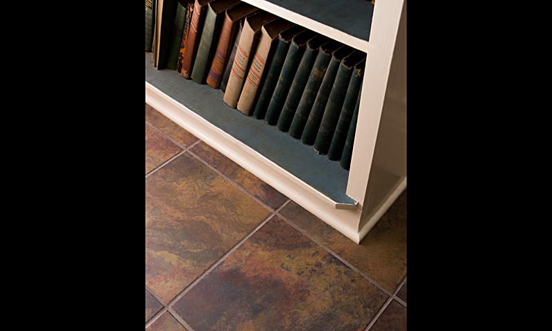 While tile floors are still a practical favorite for kitchens and baths, the variety of colors and shapes and sizes now make them work for almost any space. Here the slate-look tile was laid in a large living room space that flowed into a library nook. The same tile transitioned on into the bathroom, and even up the walls surrounding the tub. When used in a very large space, it is often a good idea to change up the pattern by laying a contrasting tile style or color somewhere inside the room. With this slate-look tile, the large spaces were laid on the diagonal, with a row of straight tiles around the perimeter of the rooms. A row of smaller rectangular tiles were laid in the doorway threshold as a transition to the next room. This technique helps reduce the risk of breaking tiles in areas of minor elevation changes.