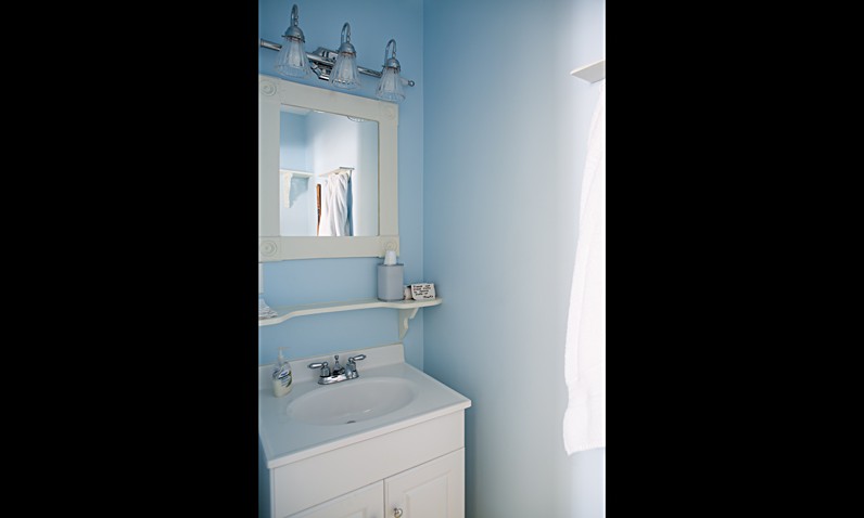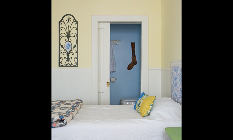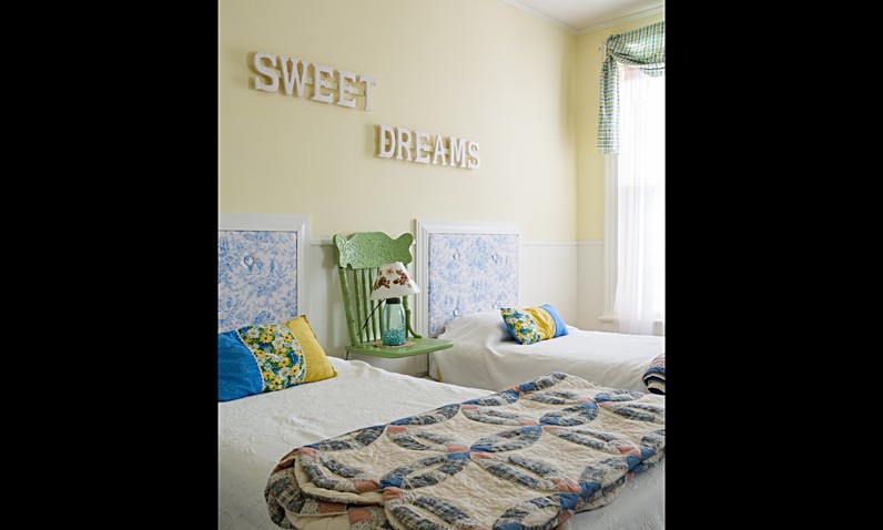 These two bedrooms were significantly upgraded by converting closet space into private bathrooms. The Yellow Dream Room closet had to be enlarged to make way for the half bath. The new space consists of a vanity with a cabinet for storage. The pocket door, a feature consistent with the period architecture of this older home, was installed to conserve space within the room. Bead board siding was added to the walls of the Dream Room, as well as two headboards custom built by Leimkuehler Construction.