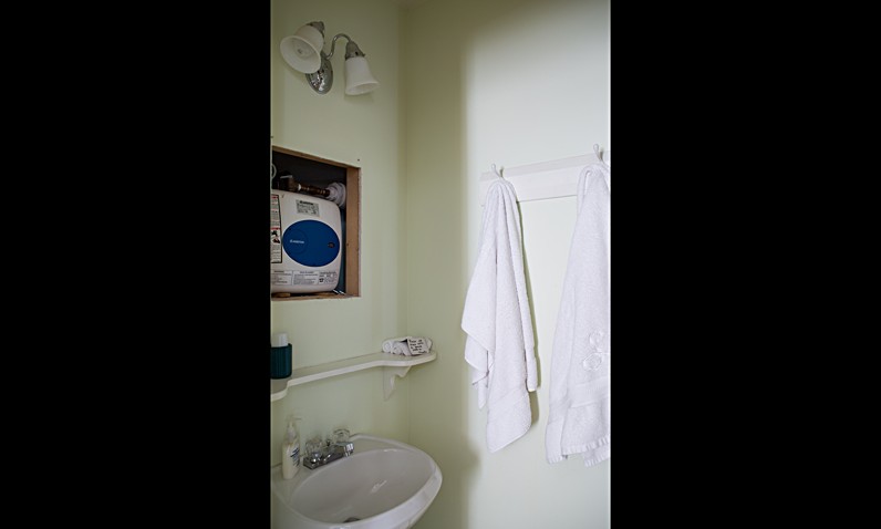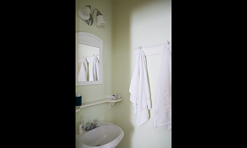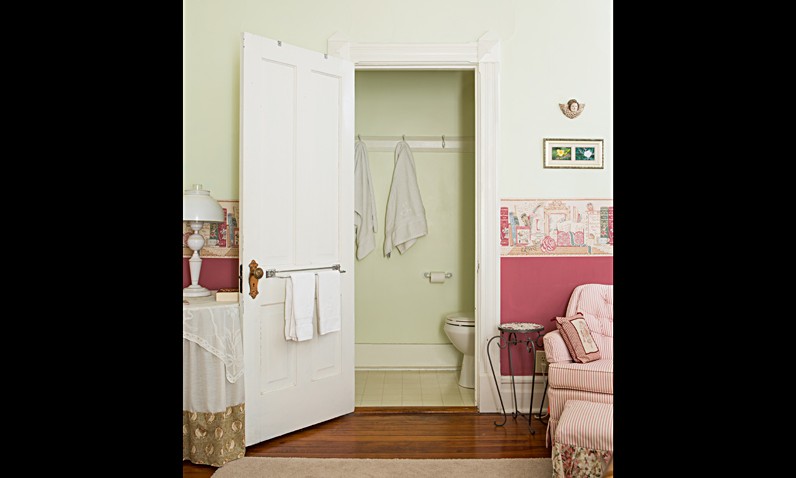 The Green Garden Room already had a closet large enough to accommodate the added half bath, but even more space was “found” by hiding the unsightly hot water heater. It was positioned on a shelf inside the wall, but guests see only the chic white-framed mirror that covers it. Creative placement of this appliance made it possible to install a pedestal sink that fits nicely into the period style and furnishings of this room and this home.